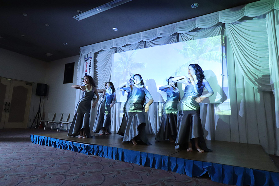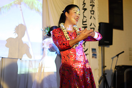 スタジオ「ホアロハ(ハワイ語で“最愛の仲間”)」を主宰する荒川則子先生率いるフラダンスチームがいきなり会場を盛り上げてくれます。