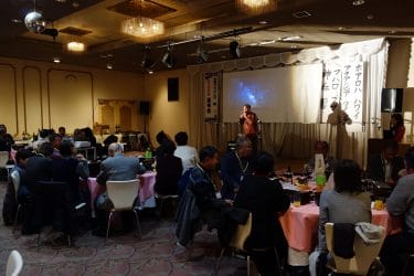 特に、新規移住者の方は、はじめての忘年会に期待いっぱい。地区ごとに用意された丸テーブルでは今日初めて出会うひとも多いのに、あちらこちらで談笑の声が飛び交います。