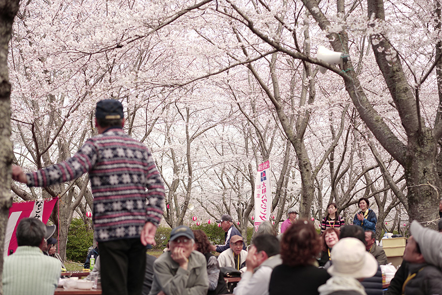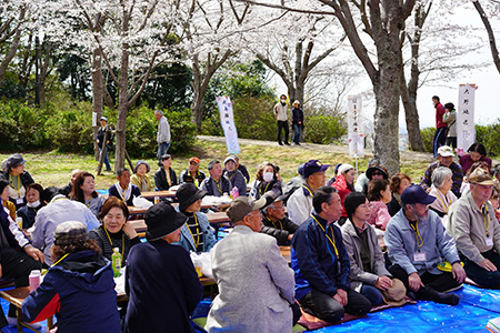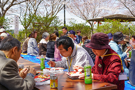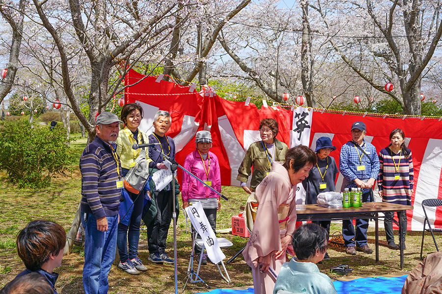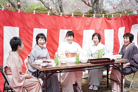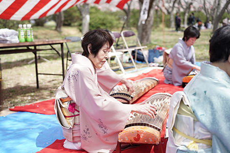 お客様のテーブルは荒野地区・大野地区・はまなす・鹿嶋灘地区の4つテーブルに分けられており、近所との繋がりを作りやすく、 話も盛り上がりやすい配置を作るという実行委員の面々の名采配のおかげもあってか、会場は大盛り上がり!風情ある桜の木々の中、 情緒漂う琴の音が会場を包み込みます。