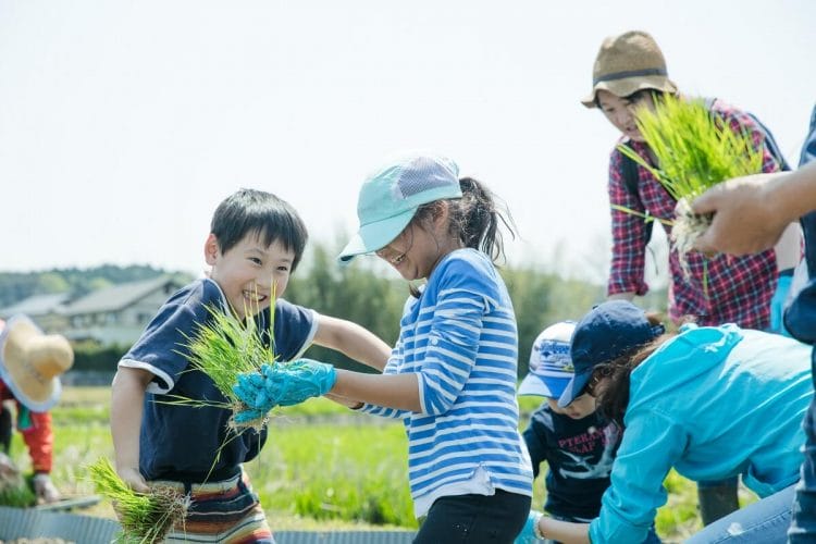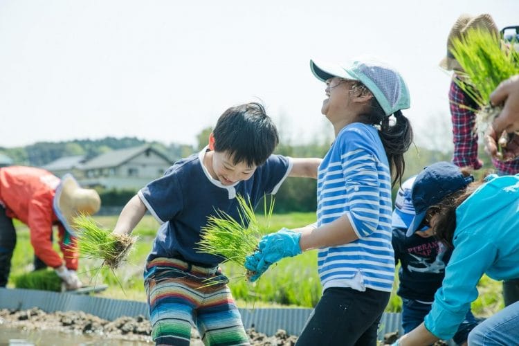 ほとんどが田植え初体験の素人集団による「大田植え大会」が始まりました。うわ〜、足が抜けない!1箇所に苗は何本ぐらい植えればいいの?ちょっと、そこのライン曲がっているよ!ママー、おたまじゃくしがいる!誰か、苗ちょうだい!