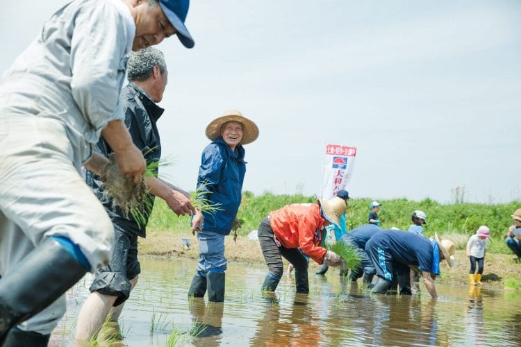 皆でお互いの労を癒しつつ、畦道でお弁当をいただきます。あとは収穫を待つのみです(実際は、除草など、大変な仕事は続くのですが、素人集団はまだ、そのことを知りません)。