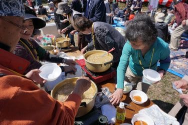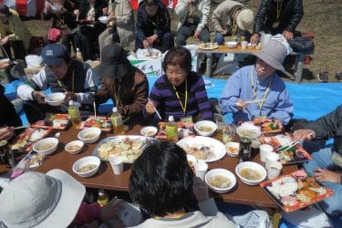 お弁当にお花見団子、お菓子、飲み物、そして豚汁。いいお天気でしたが、少し肌寒かったので、温かい汁物にみなさん感激。