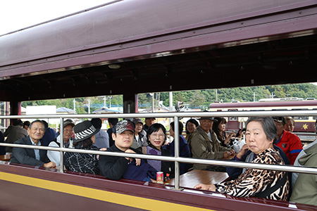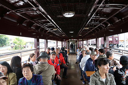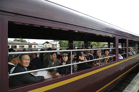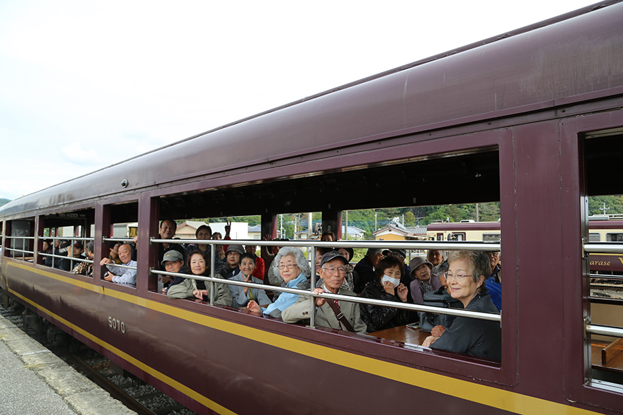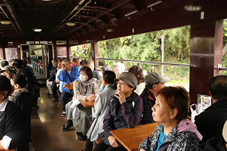 今回のメインイベントはトロッコ列車。群馬県にある大間々駅までバスを走らせます。 その間、初対面のお客様と交流を深めます。まずは隣の席から。