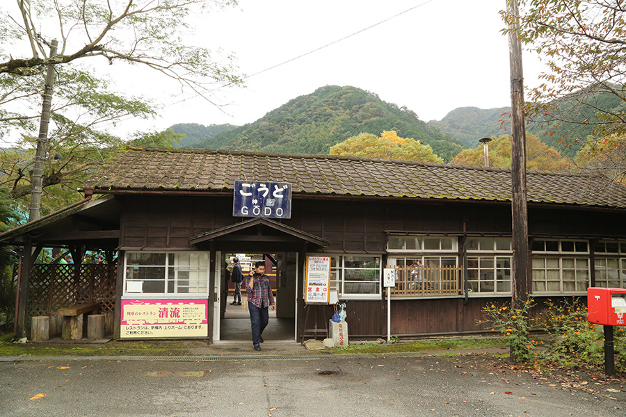 平日にもかかわらずほぼ満員の車内で、渓谷を眺めながら50分ほどすると神戸駅に到着します。