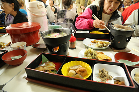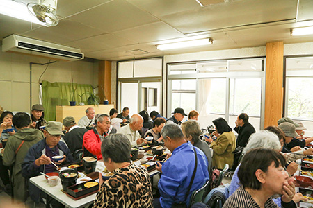 駅についた頃にはお昼時、旅の駅という食事処で昼食をとります。 舞茸の天ぷら、舞茸ご飯、舞茸のおひたしなど、舞茸尽くしの昼食を食べている皆さんの写真を撮り終え、私も昼食をいただきます。
