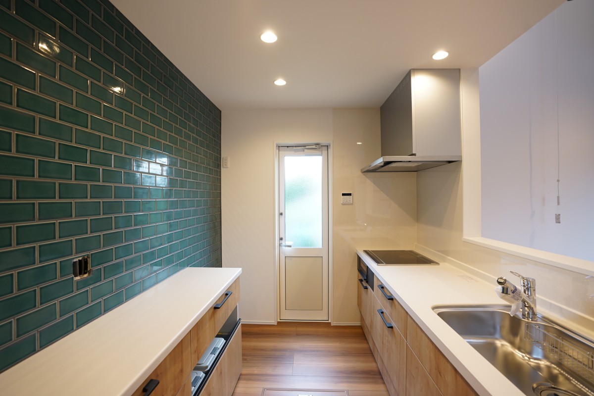 お洒落なキッチンスペース!アクセント壁のタイル貼りは◎