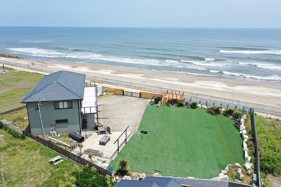 吉田さんの別荘はこれが2軒目。5年前から、このエリアの近くに別荘を保有されていましたが、友人家族も呼んで楽しめるようなもっと広い別荘を探し、鹿嶋地域に豊富な物件情報を持つ大和ハウジングに相談くださいました。 「私たちが望んでいるものを大和ハウジングさんはすぐに汲み取ってくれました。地元の繋がりをもとに、まだこれから売りに出るところだったこの物件のオーナーさんに交渉して、紹介してくださったんです。地場の不動産屋さんじゃなければ、こんな理想的な物件には出会えなかったと思います」。 海のすぐそば、1200平方メートルの広い土地に立つ、シンプルな2階建の建物。サーフボードなどを置くスペースも充分。自分たちなりの楽しみ方がすぐにイメージできた吉田さん夫妻は、すぐに決断。以前の物件を売って、こちらを購入されました。