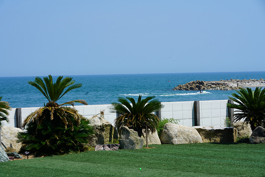 ふだんは千葉県の松戸市にお住まいで、東京都心で勤務している吉田さん。夏休みの終盤、サーフィンと海遊びに鹿嶋の別荘でお過ごしのところ、取材に立ち寄らせていただきました。午前中に海で子どもたちとたっぷり遊んで、くつろいでおられた午後にお話をお聞きできました。 2020年7月にリノベーションの工事を終えた吉田さんの別荘。まず門を入って驚くのが広大な庭。子どもたちの大きな水遊びの遊具を広げても余裕です。そして振り返れば海と空が目の前に広がる眺め。庭にはきれいな人工芝が敷かれ、子どもたちは裸足で走りまわっています。 「この人工芝は大和ハウジングさんが鹿嶋スタジアムの人工芝を扱う業者さんから質のいいものを入手してくれたんです。緑色がとてもきれいでしょう」。 広い庭、そしてその向こうに広がる海と空の気持ちよさには、子どもたちだけでなく大人もワクワクしてきます。
